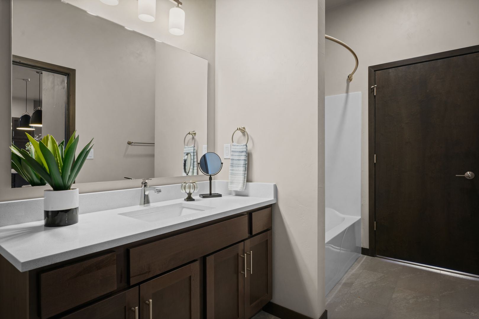 In-home amenities include upgraded stainless steel kitchen appliances, washing machine, dryer, pantry, large quartz kitchen island with USB Charging station, quartz bathroom counter-tops, bathtub, modern over island pendant lighting, dishwasher, and disposal.