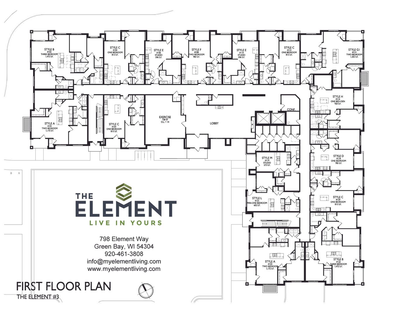 Common area amenities include Fitness Center, Lobby Lounge with Fireplace, Coffee Bar, Meeting/Work room, Two Elevators, Top Floor Indoor/Outdoor Club Room with Fireplace with views to Lambeau Field, and an Outdoor Sheltered Plaza with Two Grilling Stations and Two Fire Pits.